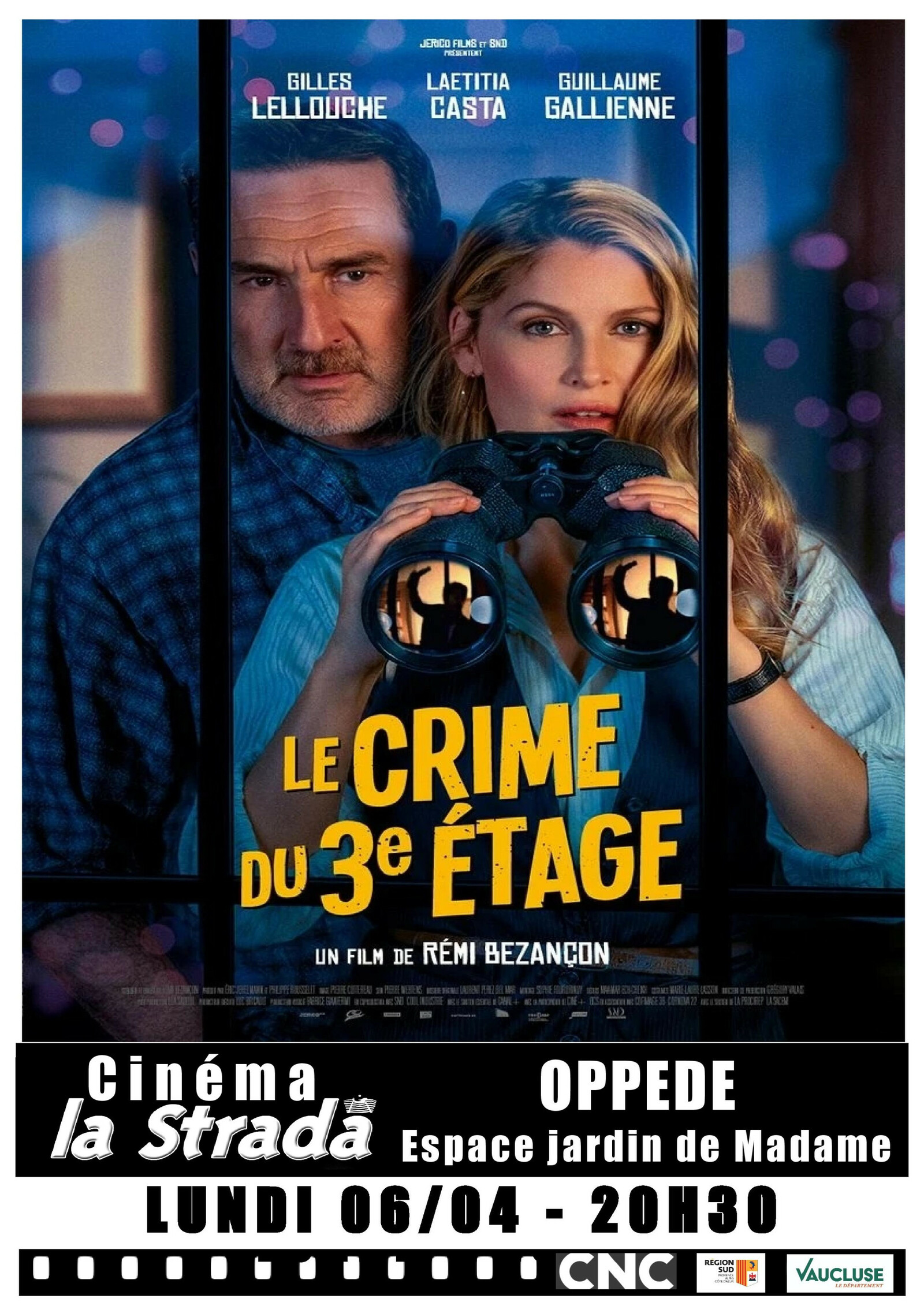 Comédie dramatique, plicier de Rémi Beznçon avec Gilles Lellouche, Laetitia Casta, Guillaume Callienne. Tout public Colette, professeur de cinéma spécialisée dans l'oeuvre de Hitchcock, soupçonne son nouveau voisin d'en face d'avoir tué sa femme. Réalité ou déformation professionnelle ? Son mari, François, écrivain de romans historico-policiers un peu désuets, est d'abord sceptique face à l'obsession de Colette pour ce prétendu crime. Il se laisse cependant embarquer dans cette enquête rocambolesque, et, à mesure que les indices s'accumulent et que le mystère s'épaissit, ce couple ordinaire se transforme en duo de détectives hors pair. Alors, y a-t-il vraiment eu un crime au 3e étage? |